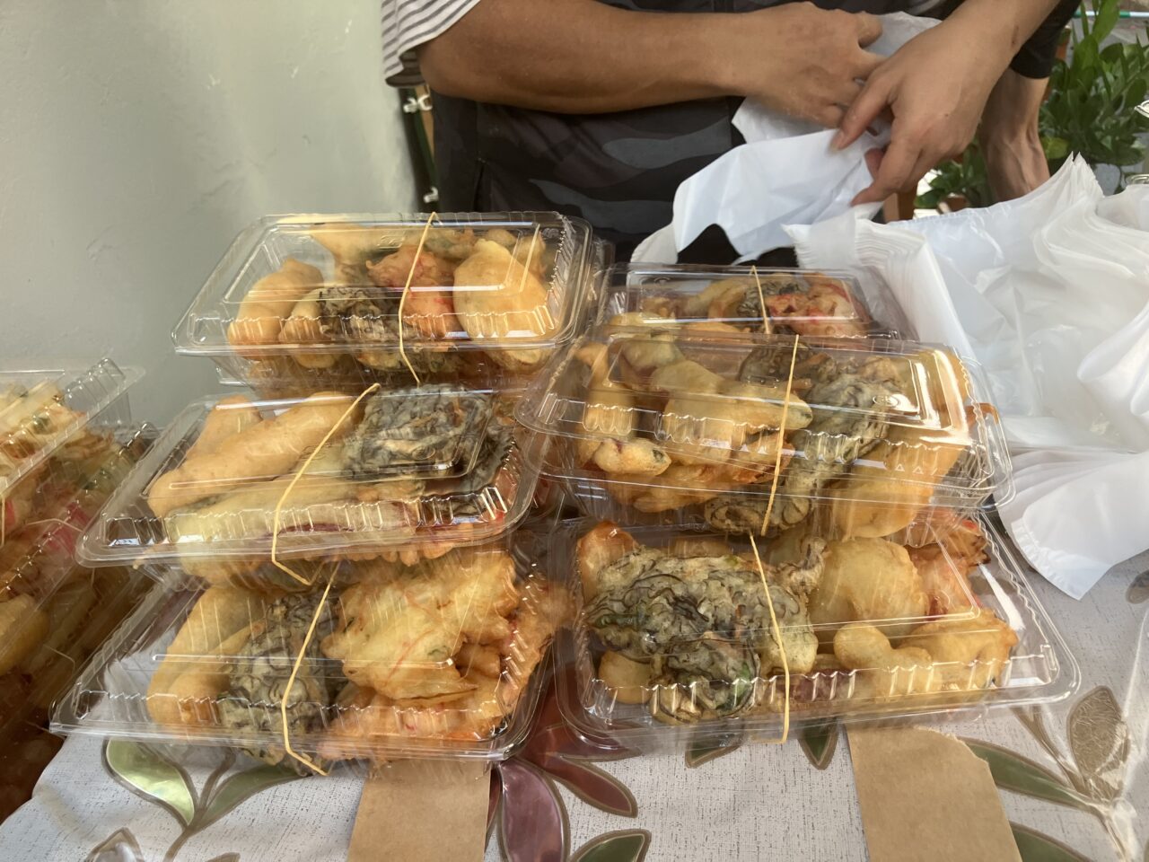 “屋富祖てんぷら屋”は創業60年。屋富祖で生まれ育った3代目が店頭に立ち、お祭り用に準備された沢山のてんぷらをさばきます。