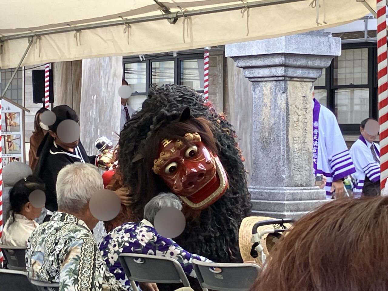 今年の例大祭の日は、平日にも関わらず沢山の方が参加されていました。会場に銅鑼(ドラ)の音が響き渡り、獅子が勢いよく鈴を振りまわします。勇敢に舞う姿は観客を魅了しました。終盤にさしかかると、獅子が観客席に下りてきました!