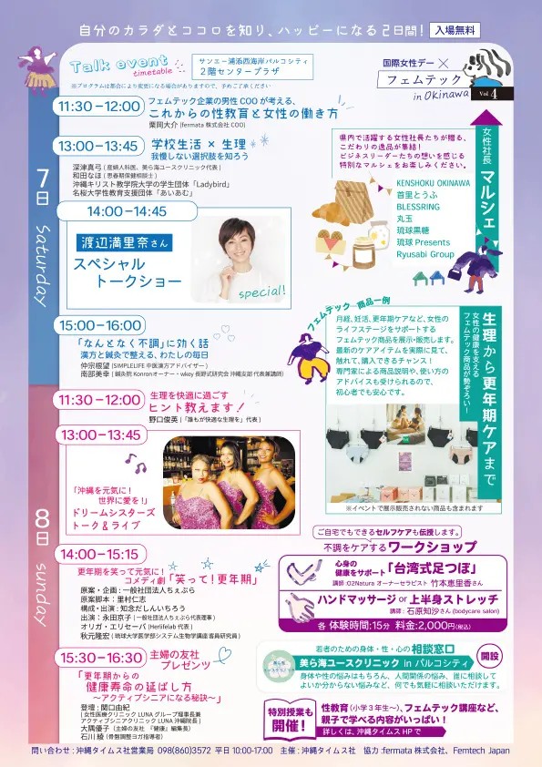 【浦添市】渡辺満里奈さんのトークショーも!サンエーパルコにて「国際女性デー×フェムテック in Okinawa Vol.4」が開催されます。2026年3月7日~8日