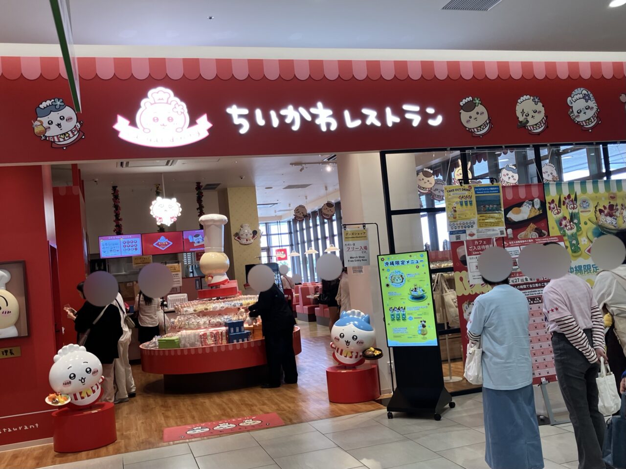レストランは1Fグリーンゾーン入り口近くにあり、大きなガラス壁にはちいかわのキャラクターがデコレーションされています。