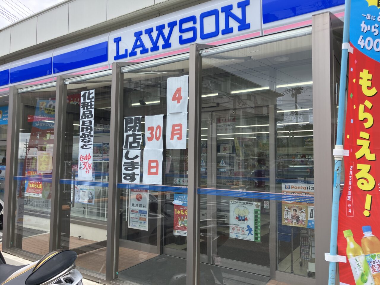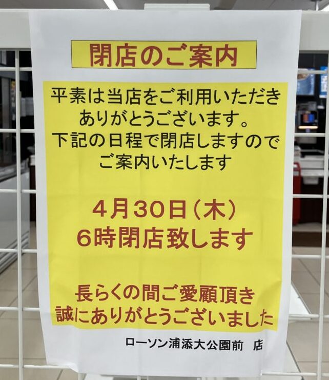 ローソン浦添大公園前店が2026年4月30日(木)6時をもって閉店することがわかりました!店頭前の張り紙には「4月30日閉店します」、「化粧品・日用品などセール中30%オフ」の文字が確認できます。